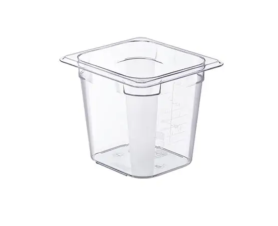 Vaschette GastroNorm 1/6: ideali per conservazione e servizio, con stampa per tracciabilitร , misurazione dei liquidi e angoli rinforzati.