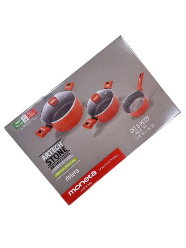 Batteria di pentole da 5 pezzi, realizzata in materiali di alta qualità e dotata di rivestimento antiaderente per una cottura sana e facile pulizia, progettata per garantire versatilità e prestazioni eccellenti in cucina.