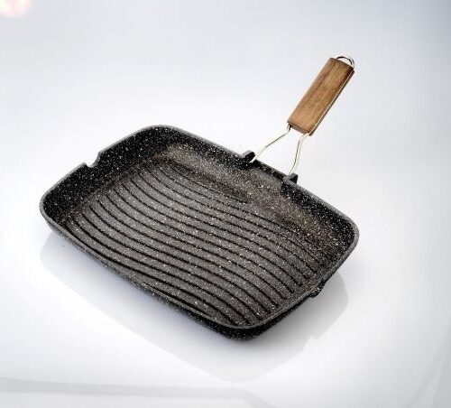 Con superficie rigata e manico pieghevole. Realizzata in alluminio pressofuso ad elevato spessore, con rivestimento antiaderente di alta qualitร . Esente da PFOA, lavabile in lavastoviglie. Prodotto 100% italiano.