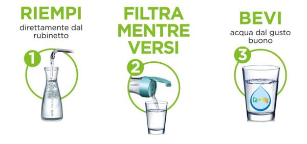 – bottiglia filtrante laica filtra mentre versa. ogni filtro e’ garantito fino a 120lt.