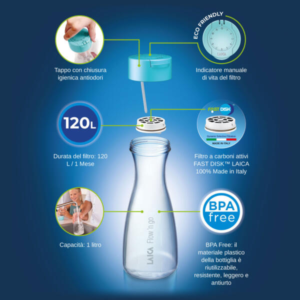 Il filtro FAST DISK™ permette di filtrare fino a 120 litri d’acqua pari a un mese di utilizzo: questa efficienza permetterebbe ad ogni famiglia di poter risparmiare fino a 80 bottiglie di plastica della capacità di 1,5 litri! Un ottimo risparmio sia in termini economici sia di impatto ambientale, sappiamo benissimo quanto siano fondamentali i nostri piccoli gesti quotidiani per migliorare la sostenibilità ambientale, possiamo contribuire tutti attuando scelte che ci permettano di fare davvero la differenza, e la Bottiglia Filtrante Laica con il filtro Fast Disk™ rappresenta un ottimo punto di partenza.