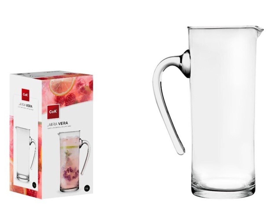 Brocca in vetro con manico da 1 litro, elegante e compatta, ideale per servire acqua, succhi o tรจ freddo, perfetta per ogni tavola.