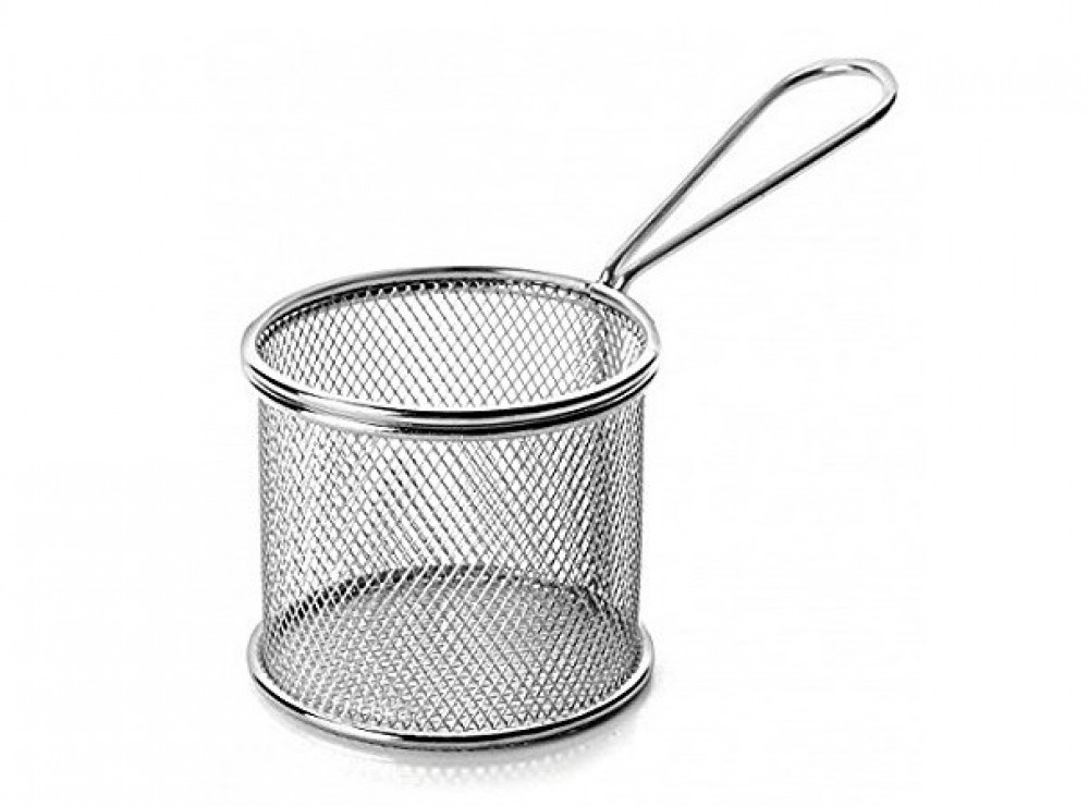 Cestino di forma rotonda cilindrica in filo di acciaio per portare in tavola snack, stuzzichini e patatine per gli aperitivi o per servire fritture di pesce o patatine fritte in maniera originale.
