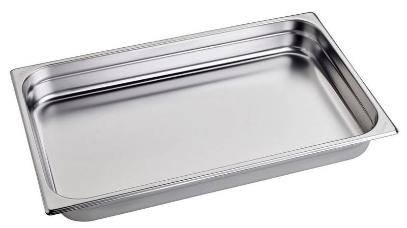 GASTRONORM 1/1 h100. Bacinella Gastronorm in acciaio inox AISI 304 GN 1/1. Dim. 530×325 altezza 100 mm. Capacità 13,3 litri.