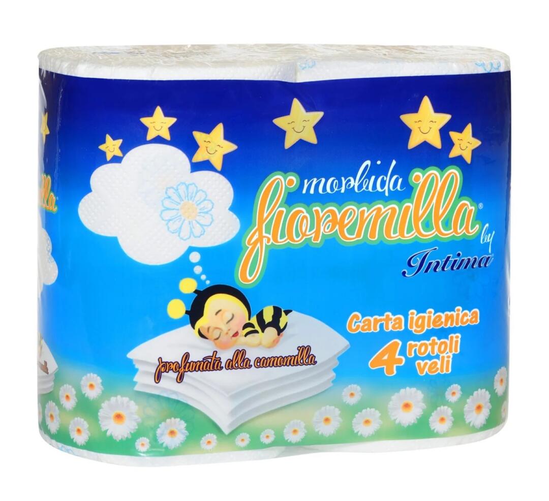 4 rotoli di carta igienica fioremilla con decoro a fiori e profumata alla camomilla