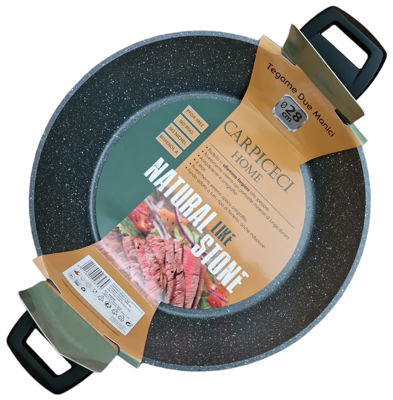 Tegame in alluminio forgiato alto spessore, antiaderente effetto pietra, antiaderente ed antigraffio, maniglie ergonomiche;