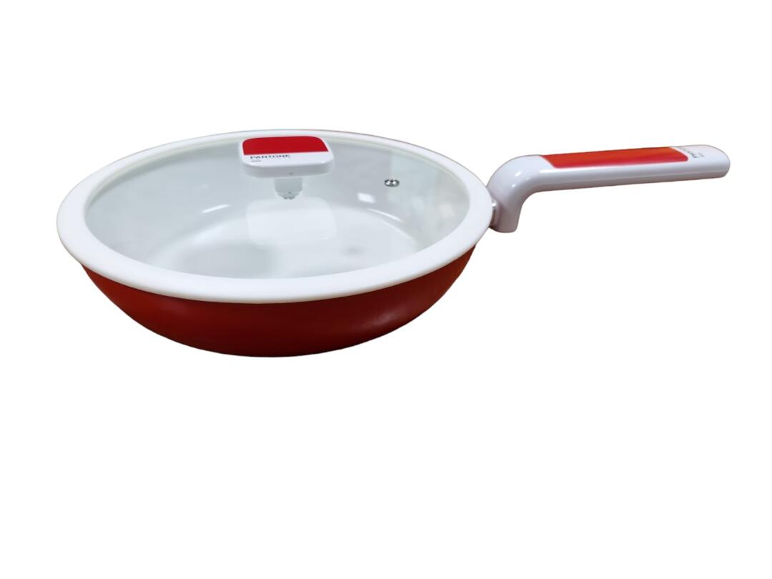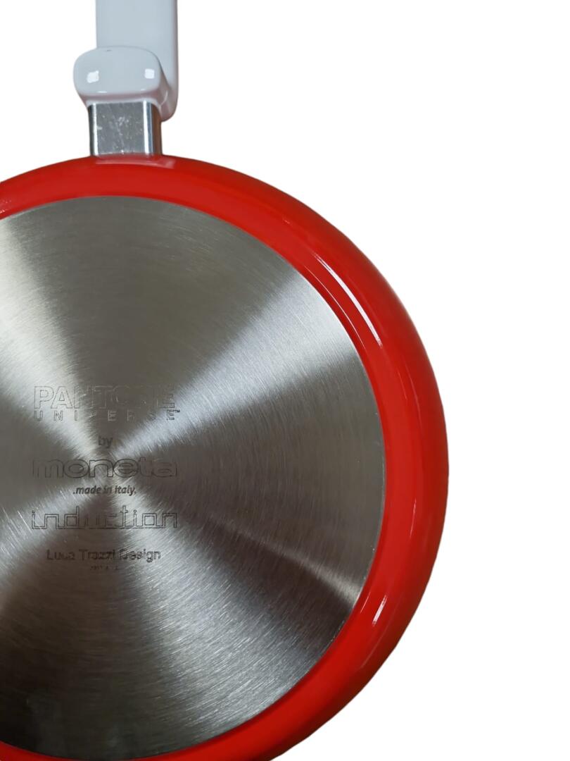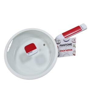 Padella della linea Pantone con coperchio, realizzata in materiali di alta qualitร e compatibile con induzione, progettata per garantire una distribuzione uniforme del calore e dotata di un rivestimento antiaderente, ideale per una varietร di preparazioni culinarie. MONETA