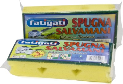 Tris spugne abrasive con impugnatura salvamani, efficaci e resistenti, utili per la pulizia di bagno, casa e cucina.