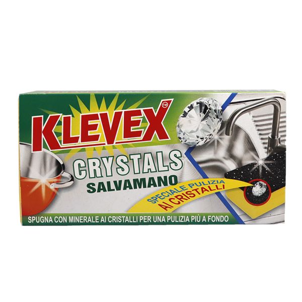 Fatigati Spugna Klevex Cristals salvamani, spugna multiuso con minerali ai cristalli, ottima per una pulizia accurata delle superfici. Rimuove facilmente le tracce di sporco, anche quello ostinato su piatti, stoviglie e superfici.
