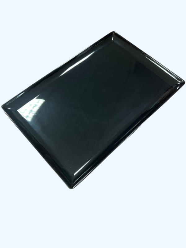 Vassoio rettangolare in melamina nera, dall’estetica elegante e moderna, ideale per la presentazione professionale di snack e finger food, con elevata resistenza e un design sofisticato.
