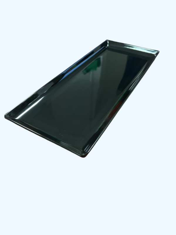 Vassoio rettangolare in melamina nera, dall’estetica elegante e moderna, ideale per la presentazione professionale di snack e finger food, con elevata resistenza e un design sofisticato.