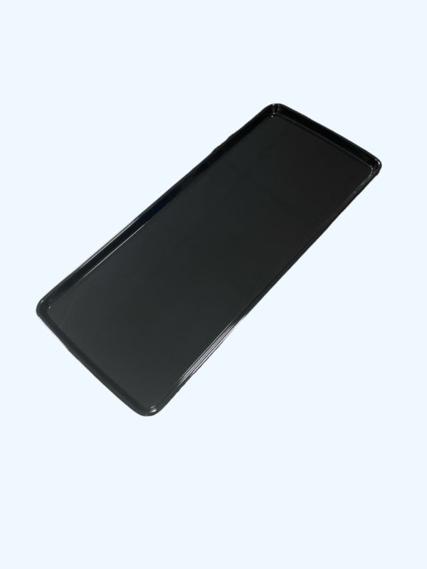 Vassoio rettangolare in melamina nera, dall’estetica elegante e moderna, ideale per la presentazione professionale di snack e finger food, con elevata resistenza e un design sofisticato.